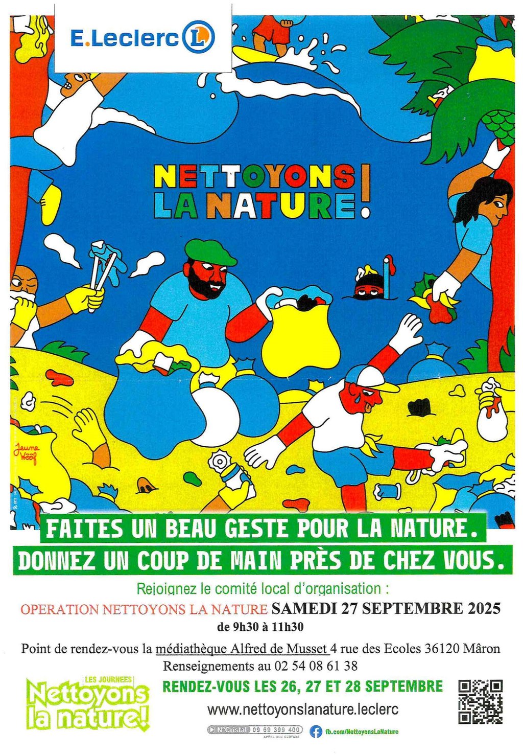 Rejoignez-nous pour participer au ramassage des déchets dans le bourg de Mâron le samedi 27 septembre. Le partenaire E.Leclerc fournit le matériel pour procéder en toute sécurité à l'opération (gants, sacs-poubelle, chasubles).