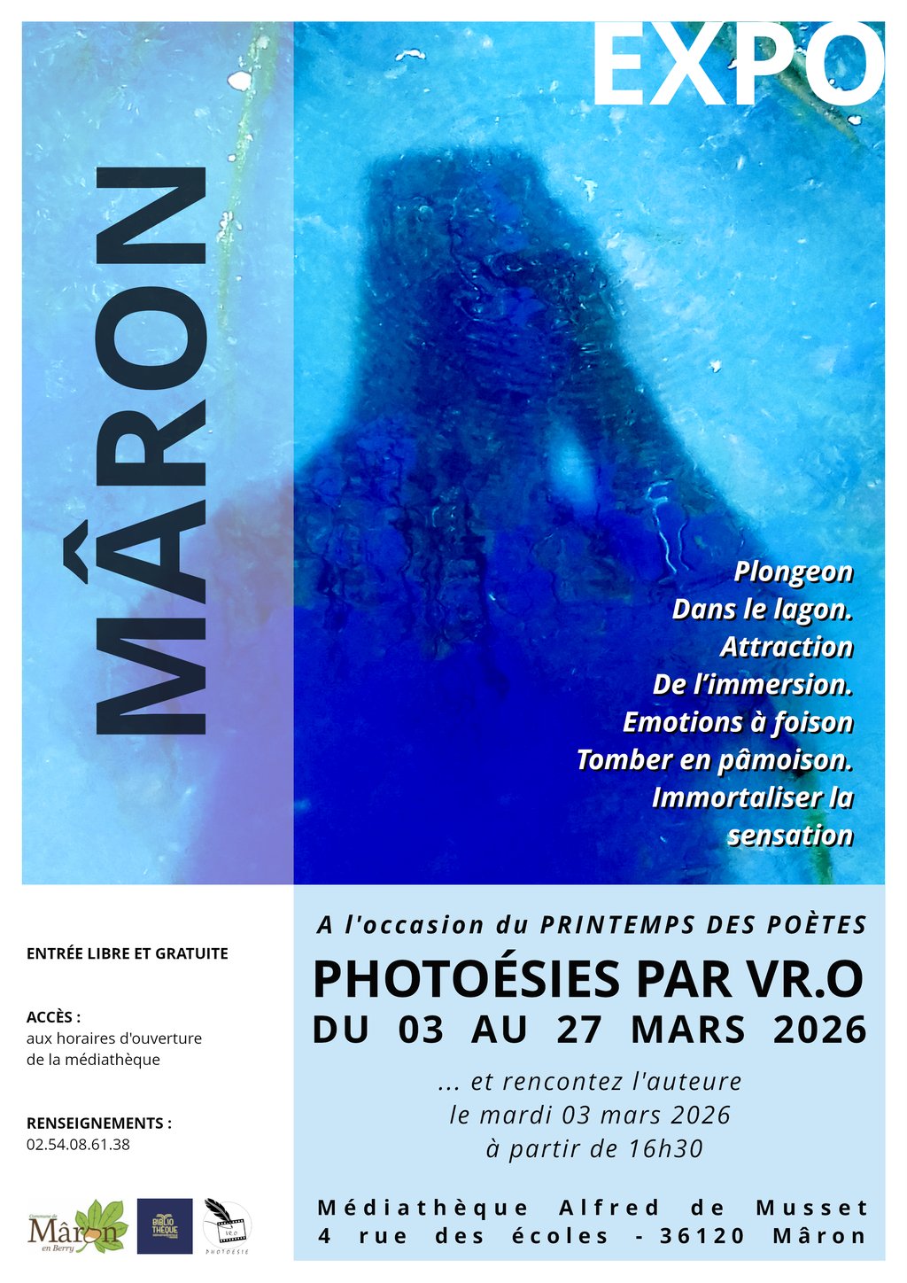 À l'occasion du printemps des poètes, V.RO revient avec une nouvelle exposition de "photésies" et un atelier d'écriture. De quoi s'agit-il ? L’exposition présentera les photographies joliment agrémentées des poésies de V.RO et pour titiller votre fibre poétique, nous proposons le mardi 3 mars à partir de 16 h 30 une initiation à la "photoésie". À partir de photographies de l'auteure ou les vôtres, vous écrirez sur le vif une ou des poésies selon l'inspiration. Un bon moment de partage en perspective. Pour adulte et enfants dès 10 ans. Accès libre et gratuit.